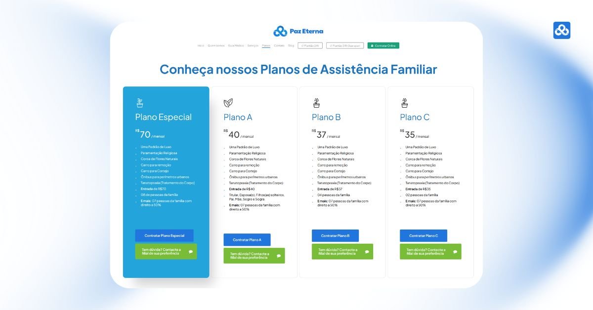 O primeiro passo é entender qual de nossos planos se encaixa melhor na sua necessidade. A boa notícia é que a qualidade do nosso serviço é a mesma para todos. Na Paz Eterna, todos os planos oferecem a mesma cobertura completa e os mesmos serviços de excelência.