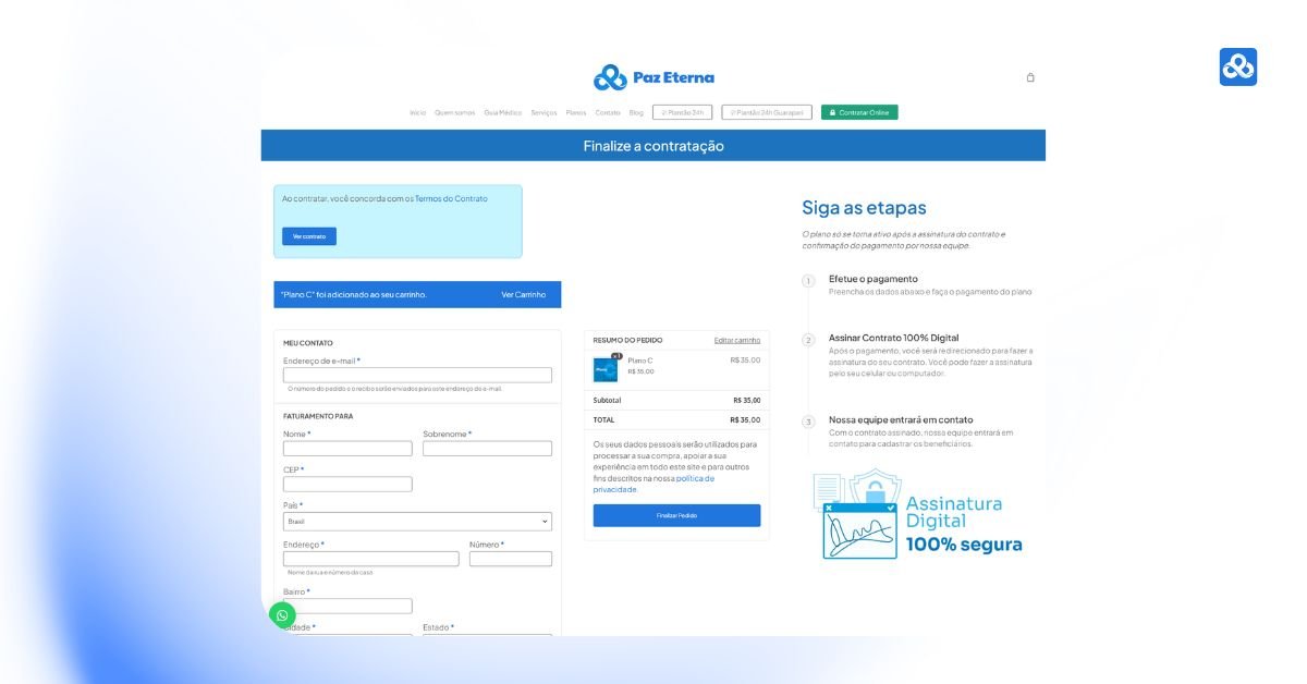 Pensar no futuro e garantir a tranquilidade de quem amamos é um dos maiores atos de cuidado que podemos praticar. No entanto, muitas pessoas adiam essa decisão por acreditarem que o processo é burocrático, demorado ou complicado. Na Paz Eterna, quebramos essa barreira: oferecemos um processo de contratação 100% digital, simples e seguro.